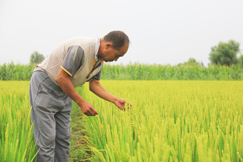 8月13日,原平市大庫狄村民王財旺正在稻田里查看長勢。山西省原平市大庫狄村依傍滹沱河不缺水的優(yōu)勢,發(fā)展水稻特色種植,生產(chǎn)的優(yōu)質(zhì)大米成為品牌,商家客戶上門收購,富了村民。預計今年畝產(chǎn)可達到千斤。(吉建平 攝)