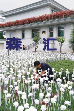 8月17日,工人師傅正在和平廣場安裝星際玫瑰燈組。從當(dāng)日晚開始,5000支玫瑰燈海將炫目廣場,為忻州創(chuàng)衛(wèi)增添新景觀