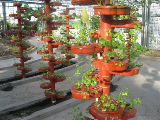 河曲縣南園村智能溫室農民技術員利用科技手段培育葉類、根類、果實類等各種瓜果蔬菜,令人耳目一新。溫室每天對外開放,讓群眾參觀學習,起到了很好的示范引領作用。圖為“螺旋柱”培育苦苣和芹菜。(賈金理 攝)