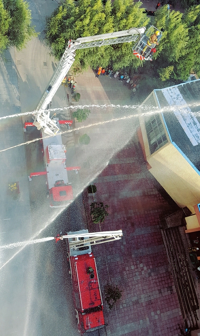 9月26日,在忻州師范學(xué)院內(nèi),當(dāng)?shù)叵啦块T舉行了國(guó)慶節(jié)前應(yīng)急疏散演練,其中包括滅火器材使用、火場(chǎng)逃生自救等演練項(xiàng)目。(樊晶璟 攝)