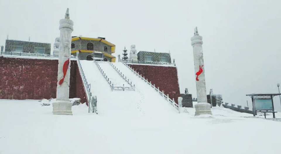 此次降雪主要分布在五臺(tái)山平均海拔2800米以上的五座臺(tái)頂。因?yàn)榕_(tái)頂與臺(tái)懷腹地海拔相差1000米以上,所以時(shí)有“臺(tái)懷飄雨臺(tái)頂雪”的奇觀出現(xiàn)。東臺(tái)頂亦名望海峰,《清涼山志》載:“蒸云寢壑,爽氣澄秋,東望明霞,若陂若境,即大海也。亦見(jiàn)滄瀛諸州,因以為名?!蓖7迨俏迮_(tái)山觀日出的絕佳位置。7日一大早,東方不見(jiàn)明霞,整個(gè)東臺(tái)頂銀裝素裹,霧靄茫茫,天籟梵音依舊,在圣潔的佛國(guó)仙境踏雪而行,更深切地感受人生一步一個(gè)腳印的意義。(本報(bào)記者 馬卓超 通訊員 覺(jué)一 攝影報(bào)道)