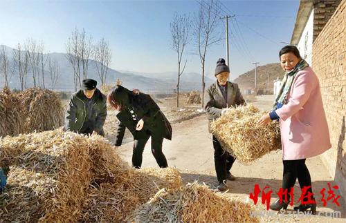 “各精準(zhǔn)扶貧戶,現(xiàn)在到村委會(huì)院內(nèi)給羊領(lǐng)取草料,快些??!”12月10日上午,岢嵐縣嵐漪鎮(zhèn)石家會(huì)村的大喇叭上不斷傳來(lái)廣播,村民們奔走相告,在村的精準(zhǔn)扶貧對(duì)象紛紛來(lái)到村委會(huì)院內(nèi)。頓時(shí),村委會(huì)院內(nèi)像過(guò)年一樣熱鬧,拉草料的大車已經(jīng)停了一溜,每輛車上都是50斤一捆的草料,臺(tái)階上擺著整齊的桃心圖案的漆布、嶄新的鍋蓋、床單,第一書記楊英正在跑前跑后招呼著老鄉(xiāng)們前來(lái)領(lǐng)取物品、簽字。