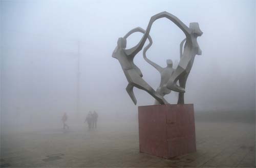 2017年1月3日,江蘇連云港贛榆區(qū)市民在大霧中出行。