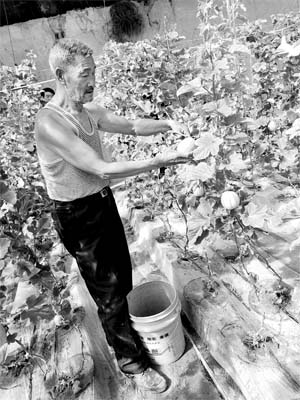 4月11日,忻府區(qū)部落村金山農(nóng)業(yè)示范園區(qū),68歲的村民馮永安在自己的大棚內(nèi)采摘香瓜。七年前,他敢嘗敢試開始種植大棚香瓜,每到這個(gè)香瓜上市的季節(jié),他和老伴吃住在大棚,精心待弄這些寶貝疙瘩,光這一畝大棚香瓜,每年都可以給他帶來十萬元左右的收入。尤其是近兩年,他自創(chuàng)科學(xué)方法,改良連種土壤,使香瓜的品質(zhì)、產(chǎn)量都保持穩(wěn)定勢(shì)頭,深受市場歡迎。他不僅帶動(dòng)本村村民共同致富,而且為慕名而來的同行熱心傳授技術(shù),成為遠(yuǎn)近聞名的大棚香瓜種植專家。本報(bào)記者 聶艷英 攝