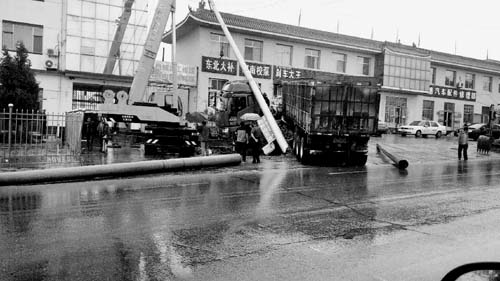 當(dāng)天夜里,五臺(tái)縣東冶鎮(zhèn)遭遇持續(xù)強(qiáng)降水天氣過程,公司調(diào)控中心值班員在凌晨3時(shí)22分發(fā)現(xiàn)10千伏829北大街線速斷掉閘,立刻電話通知所管轄區(qū)東冶供電所。得知情況后,該供電所組織搶修人員迅速趕往事故現(xiàn)場(chǎng),勘查電桿及線路受損情況。經(jīng)查勘,原來是一輛重型載貨卡車在駛經(jīng)五臺(tái)縣東冶鎮(zhèn)時(shí),因連夜大雨導(dǎo)致路面濕滑把一基電桿給撞倒了,斷裂的電桿壓在大卡車上,大卡車無法行駛。這一意外事件,造成了10千伏北大街線失電、沿線居民用電中斷。10千伏829北大街線是東冶鎮(zhèn)街道主要干線,生產(chǎn)任務(wù)繁重,能否盡快恢復(fù)送電直接關(guān)乎沿線居民的切身利益。