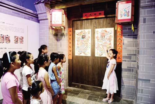 7月30日,小講解員在武強(qiáng)年畫(huà)博物館介紹年畫(huà)門(mén)神。