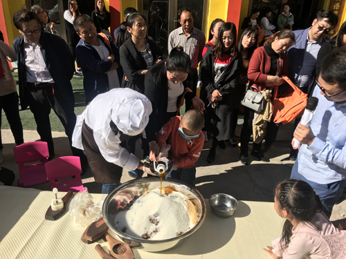 一方水土養(yǎng)一方人,一塊小餅生一地財(cái)。神池縣大人、小孩特別感恩當(dāng)?shù)卣龑?dǎo)農(nóng)民把地產(chǎn)胡油自然資源優(yōu)勢傳化為商品經(jīng)濟(jì)優(yōu)勢,以月餅帶動當(dāng)?shù)剞r(nóng)民脫貧增收發(fā)展經(jīng)濟(jì)的功勞。9月16曰,該縣一家校外語言培訓(xùn)機(jī)構(gòu)在金口玉言口才學(xué)校的校園里別開生面舉辦了“迎中秋食品安全知識宣傳暨傳承神池傳統(tǒng)月餅手工戶外體驗(yàn)活動”。此舉不僅培養(yǎng)了小孩熱愛家鄉(xiāng)的意識和感恩心理,也提高小孩熱愛勞動的動手能力,同時加強(qiáng)孩子們的食品安全知識,受到好評。記者現(xiàn)場看到,家長們從家里帶來了烤箱,學(xué)校準(zhǔn)備好了玫瑰、青紅絲、核桃仁、花生米、葡萄干、芝麻等餡料,孩子們你一言我一語討論著自己動手做月餅的事,在觀看面點(diǎn)阿姨細(xì)致地講解與示范后,每個小朋友都躍躍欲試,體驗(yàn)親手做家鄉(xiāng)特產(chǎn)的樂趣。