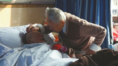 老兩口70年前結(jié)婚時(shí)的老照片。 廖思源從家里的木質(zhì)老式柜子里,拿出一本相冊(cè)。他用布滿(mǎn)皺紋的手翻開(kāi),拿出一張黑白婚紗照,看了又看:廖思源身著白襯衣和西裝,打著領(lǐng)帶,看起來(lái)格外精神。鐘貞淑頭戴婚紗,一席花色的長(zhǎng)裙,右手捧著鮮花。兩人手挽著手,表情有點(diǎn)嚴(yán)肅,濃濃的年代感將時(shí)間拉回到了1949年。 廖思源和鐘貞淑是同學(xué),上世紀(jì)40年代,兩人都20出頭,廖思源用當(dāng)時(shí)少見(jiàn)的“手法”追求鐘貞淑。他讀的是金融財(cái)會(huì)專(zhuān)業(yè),會(huì)英文,經(jīng)常用英文給鐘貞淑寫(xiě)信。那些說(shuō)不出口的肉麻情話(huà),被廖思源用鐘貞淑看不懂的語(yǔ)言寫(xiě)了進(jìn)去,最終靠書(shū)信贏得了鐘貞淑的芳心。兩人戀愛(ài)后結(jié)婚,之后育下三子一女。 婚后的生活很平淡,但在兒子廖思明眼里,父母一直很恩愛(ài)。兩人退休后出門(mén)散步逛街,走哪兒都是牽著手,“我爸是火巴耳朵,我媽性子比較急躁一些,有時(shí)候罵我爸說(shuō)他不對(duì),他就聽(tīng)到,說(shuō)我媽說(shuō)啥子都是對(duì)的?!眱扇讼矚g到處旅游,全國(guó)各地到處走,幾乎拍的每一張照片都是緊緊依偎在一起,誰(shuí)看到都感到甜蜜和親昵。 B 命運(yùn) 妻子患病失憶 患癌丈夫悉心照料 十多年前,廖思源被查出患前列腺癌,一聽(tīng)到癌癥,鐘貞淑嚇壞了,躲在房間里一直哭。好在病情不算嚴(yán)重,廖思源每個(gè)月靠打針吃藥就能緩解病痛,但鐘貞淑在一次意外后,卻再也不能回到健康的狀態(tài)了。 2015年,鐘婆婆在家意外跌倒,診斷為腦部血腫和肺部感染,一直處于昏迷狀態(tài),醫(yī)院也下了病危通知書(shū)。近三個(gè)月后,鐘貞淑奇跡般地醒了過(guò)來(lái),并在家人的照料下慢慢好轉(zhuǎn)。沒(méi)想到,她在此時(shí)卻又患上了另一種?。喊⑵澓DY,俗稱(chēng)老年癡呆。 這樣的病情,讓家人都難以接受。從最開(kāi)始地記不住往事,到記不住親人的名字,到最后幾乎完全失憶,廖思源經(jīng)歷了整個(gè)過(guò)程。 “她得了老年癡呆,她已經(jīng)94歲了,不記得我了?!绷嗡荚匆蛔忠痪湎蛴浾咧v述著,鐘貞淑已經(jīng)不記得自己是誰(shuí)了。三年來(lái),鐘貞淑每天都躺在病床上,兒女都將近70歲,精力有限,無(wú)法細(xì)致照料。除了每天有護(hù)工照顧外,廖思源從不缺席。 每天早晨,廖思源6點(diǎn)過(guò)就起床,和家里的保姆一起去菜市買(mǎi)菜。選好菜后,廖思源叮囑保姆將幾種有營(yíng)養(yǎng)的食材做成飯,然后他親自去醫(yī)院守著鐘婆婆吃。“每天都要去兩次,上午下午各一次。都說(shuō)他年齡大了不要跑,他不答應(yīng),刮風(fēng)下雨都要去?!?/p> C 表白 每天醫(yī)院說(shuō)情話(huà)“你就是我的寶貝” 廖思源家離醫(yī)院只有幾百米的距離,但96歲的他要走過(guò)去卻并不容易,他出門(mén)后會(huì)坐一輛三輪車(chē),到醫(yī)院門(mén)口后自己坐電梯上樓,拄著拐杖走過(guò)整個(gè)走廊。 “我要來(lái)給她按摩,她躺久了,肌肉要萎縮?!绷嗡荚葱奶鄣卣f(shuō),妻子有時(shí)候甚至錯(cuò)認(rèn)他是她的父親,這讓他感到無(wú)奈,但這并不妨礙他每天悉心的照顧。 “鐘婆婆,我來(lái)看你了?!辩娯懯缈吹接腥藖?lái)看她,張開(kāi)嘴似乎想說(shuō)什么,但只發(fā)出模糊的聲音。 也許是認(rèn)不出廖思源,鐘婆婆有些排斥,廖思源開(kāi)始從她的腿部做按摩,幫助她活動(dòng),然后慢慢捏手,再撓頭部。他一邊捏著一邊安慰她,“來(lái)嘛,按了好?!?/p> 每天在醫(yī)院,廖思源也會(huì)幫助鐘貞淑回憶往事,“你好多歲了曉得不,你94歲了!”雖然鐘婆婆并不能完全聽(tīng)懂廖思源的話(huà),但會(huì)在廖思源靠近她的時(shí)候,露出些許笑容。 “廖大爺‘肉麻’得很哦,他天天要給鐘婆婆說(shuō),你是我的小寶貝,你要快點(diǎn)好起來(lái),我愛(ài)你?!贝蠹叶颊f(shuō),很少見(jiàn)老年人這么說(shuō)“肉麻”的話(huà),可在鐘婆婆住院的這段時(shí)間里,廖思源每天都要說(shuō)給她聽(tīng)。 廖思明說(shuō),母親年輕的時(shí)候喜歡唱歌,父親也陪著她唱,這個(gè)習(xí)慣他們現(xiàn)在還保留著。廖思源唱了一首四川民歌《太陽(yáng)出來(lái)喜洋洋》。“來(lái)嘛,一起唱!”廖思源聲音有點(diǎn)慢,一臉深情地望著鐘貞淑,希望她能跟得上?!疤?yáng)出來(lái)喲喂,喜洋洋啰……”也許是歌聲喚起了鐘貞淑的部分回憶,一聽(tīng)到這首歌,她也張開(kāi)了嘴唱和著,盡管吐詞不大清楚,卻一直聽(tīng)著廖思源唱,看著他等自己跟著唱。見(jiàn)到鐘婆婆有了反應(yīng),廖思源也露出了微笑。 D 堅(jiān)持最長(zhǎng)情的告白“希望陪她活到100歲” 廖思明說(shuō),母親病重的這幾年來(lái),家人都以為她挺不過(guò)來(lái)了,但她都堅(jiān)持了下來(lái)。“連醫(yī)生都說(shuō)這是愛(ài)情的力量,陪伴才是最好的告白?!绷嗡荚春顽娯懯缃衲陝偤媒Y(jié)婚70年,無(wú)微不至的關(guān)愛(ài)在外人看來(lái)是偉大的愛(ài)情,但在廖思源看來(lái)卻是理所當(dāng)然的事。每當(dāng)有人問(wèn)他為什么要這樣照顧鐘婆婆時(shí),他也不多說(shuō),只說(shuō)一句:“因?yàn)槲覀兪欠蚱?。”在他看?lái),結(jié)婚就是一輩子的契約,“巴不得鐘婆婆活到100歲,以后的日子還會(huì)一直陪到她?