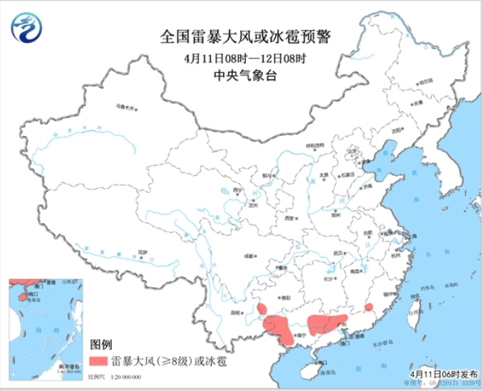 預(yù)計(jì)4月11日08時(shí)至12日08時(shí),貴州西南部、福建西南部、廣西西部和東部、廣東西北部等地的局地將有8-10級雷暴大風(fēng)或冰雹天氣;此外,貴州西南部、福建西部、廣西大部、廣東中北部等地的部分地區(qū)將有短時(shí)強(qiáng)降水天氣,小時(shí)雨強(qiáng)20-40毫米,局地可達(dá)50毫米以上。