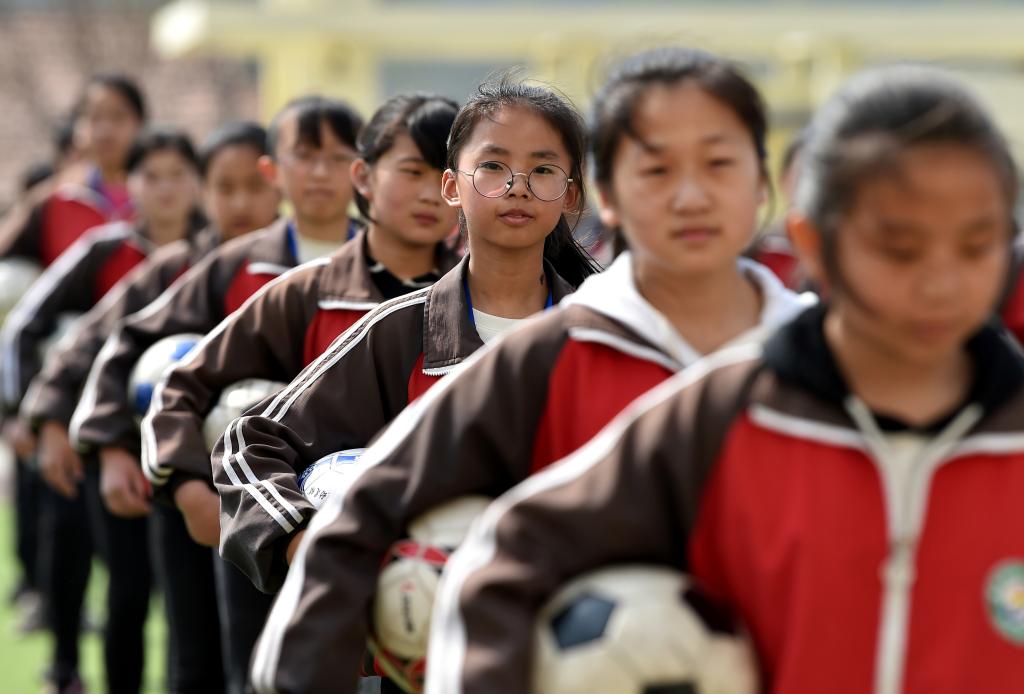 ↑這是學生們在做足球操(4月18日攝)。新華社記者詹彥攝