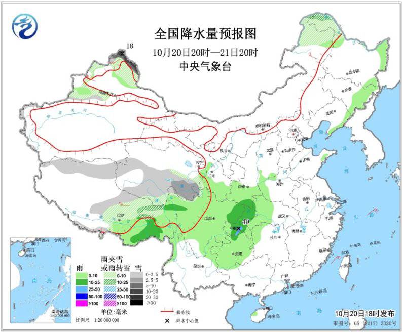 10月20日20時至21日20時,新疆北疆北部和西部、青海南部、西藏北部、內(nèi)蒙古東北部、黑龍江西北部等地的部分地區(qū)有小到中雪或雨夾雪,其中,北疆北部山區(qū)有大到暴雪(10~18毫米)。西藏東南部、陜西南部、四川盆地東部、重慶大部、貴州北部等地的部分地區(qū)有中到大雨(10~40毫米)。內(nèi)蒙古東部、東北地區(qū)北部、新疆北部、西藏北部等地的部分地區(qū)有4~6級風,新疆山口風力可達10級左右(見圖1)。