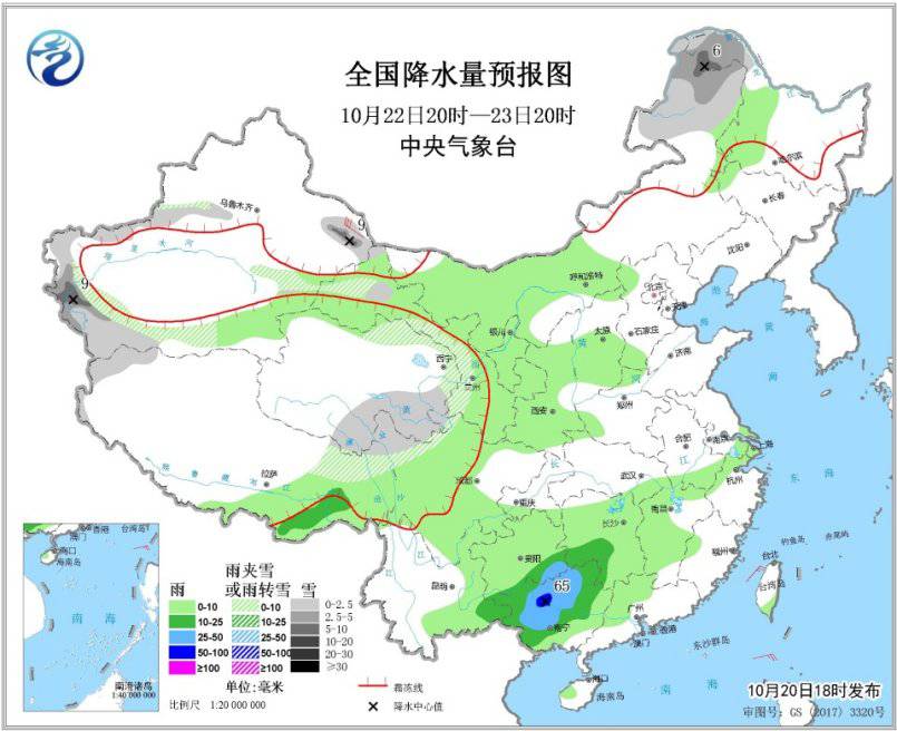 10月22日20時至23日20時,新疆沿天山地區(qū)和南疆西部、青海東南部、西藏東北部及內(nèi)蒙古東北部、黑龍江西北部等地有小到中雪或雨夾雪,局地大雪(5~9毫米),西北地區(qū)東部、內(nèi)蒙古中西部、山西南部、西南地區(qū)東南部、江南中西部、華南大部等地有小雨,其中貴州東南部、廣西中北部等地有中到大雨,局地有暴雨(50~65毫米)。新疆東部部分地區(qū)有5~6級風(見圖3)。