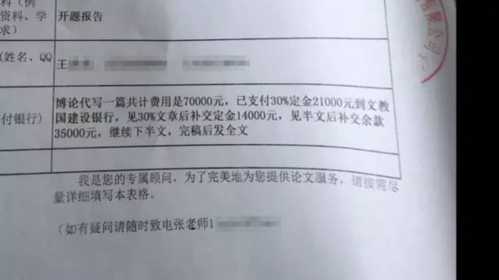 在這里,只要交一千多塊錢,一篇職稱論文就能代寫保發(fā),而學位論文則要貴一些。博士論文大概一篇大概五、六萬元,碩士論文則是五千到一萬元左右,難度大一些的比如醫(yī)學類的論文則要更貴,一篇碩士論文要價大概一萬七左右。