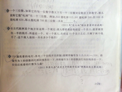 “150盞亮著的電燈,各有一個拉線開關(guān)控制,被順序編號為1,2,3,4,…,150。將編號為3的倍數(shù)的燈的拉線各拉一下,再將編號為5的倍數(shù)的拉線各拉一下,拉完后亮著的燈數(shù)為幾盞?”這是一道考公因數(shù)和公倍數(shù)的思維數(shù)學(xué)題,今年暑假,才上完三年級的羅弋在做四年級的數(shù)學(xué)競賽題集《培優(yōu)新幫手》時遇到此題,算出答案“90”與標(biāo)準(zhǔn)答案“80”不符,媽媽陳群只當(dāng)兒子錯了。