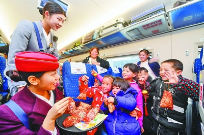 1月24日,在重慶開(kāi)往福州的G1755次列車上,乘務(wù)員和“小候鳥(niǎo)”做游戲。春運(yùn)期間,大批務(wù)工人員子女隨長(zhǎng)輩踏上與父母團(tuán)聚的旅途,南鐵福州客運(yùn)段提前對(duì)重點(diǎn)線路乘務(wù)組進(jìn)行兒童陪護(hù)培訓(xùn),在列車上準(zhǔn)備了書(shū)本和玩具,用愛(ài)心護(hù)航“小候鳥(niǎo)”的團(tuán)圓路。新華社記者 宋為偉攝