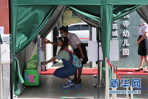 新華網(wǎng)北京6月4日電 6月3日,為做好兒童返園準(zhǔn)備,北京市西城區(qū)三教寺幼兒園進(jìn)行了開園模擬演練。此次演練由幼兒園老師扮演家長(zhǎng)和孩子,旨在讓老師知曉幼兒園防護(hù)措施且有的放矢地去開展活動(dòng),并通過線上的方式讓孩子們知道如何進(jìn)行自我保護(hù)。