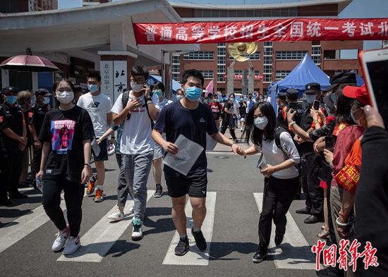 7月7日上午,北京市豐臺(tái)區(qū),北京市第十二中學(xué)考點(diǎn),結(jié)束上午的考試后,高考考生們走出考場(chǎng),一位考生從人群中牽起家人的手。當(dāng)天是2020年全國統(tǒng)一高考第一天,據(jù)了解,今年北京市高考在7月7日至10日舉行,共49000多名考生,設(shè)17個(gè)考區(qū),132個(gè)考點(diǎn)學(xué)校,2867個(gè)考場(chǎng),每考場(chǎng)考生人數(shù)由過去的30人減至20人。中青報(bào)·中青網(wǎng)記者 李崢苨/攝