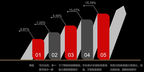 廉思課題組的報(bào)告顯示,缺乏急救知識(shí)是大學(xué)生不愿參與現(xiàn)場(chǎng)急救的原因之一。當(dāng)遇到呼吸停止的無意識(shí)人員時(shí),68.33%的被調(diào)查者選擇“撥打120,并在原地等候”,能“立即上前查看,并采取急救措施”的只有25.76%。
