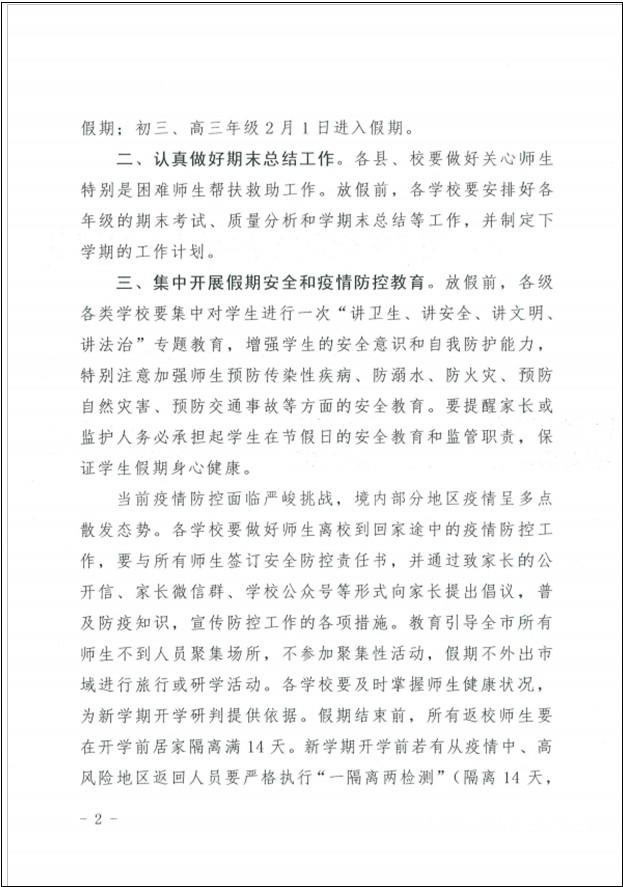 根據(jù)省、市疫情防控工作領(lǐng)導(dǎo)小組及省教育廳視頻會議精神和我市新冠疫情防控最新形勢,為保障全市師生生命安全和身體健康;經(jīng)市委、市政府同意,現(xiàn)將2021年寒假及假期前后工作安排如下,請遵照執(zhí)行。