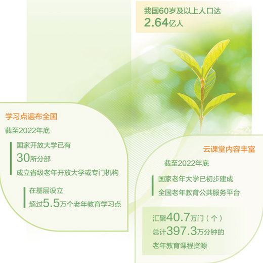課堂上,聆聽中國工程院院士張伯禮講授《中醫(yī)藥助力老年健康》;教室里,學(xué)習(xí)插花藝術(shù)、詩歌朗誦、健康養(yǎng)生等豐富課程;平臺上,全國老年教育公共服務(wù)在線資源觸手可及……