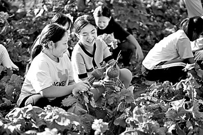 河北省樂亭縣新寨鎮(zhèn)蘭坨小學(xué)學(xué)生在“校園農(nóng)場”收獲蘿卜。新華社發(fā)