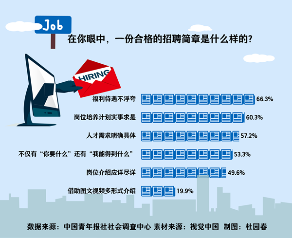 日前,中國青年報社社會調(diào)查中心聯(lián)合問卷網(wǎng)(wenjuan.com),對1334名應(yīng)屆大學(xué)生進(jìn)行的一項調(diào)查顯示,在他們眼中,一份合格的招聘簡章,首先是福利待遇不浮夸(66.3%),其次是崗位培養(yǎng)計劃實事求是(60.3%),再次是人才需求明確具體(57.2%)。