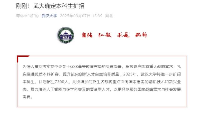 3月7日,據(jù)武漢大學(xué)微信公眾號(hào)消息,為深入貫徹落實(shí)黨中央關(guān)于優(yōu)化高等教育布局的決策部署,積極響應(yīng)國(guó)家重大戰(zhàn)略需求,扎實(shí)推進(jìn)優(yōu)質(zhì)本科擴(kuò)容,提升拔尖創(chuàng)新人才自主培養(yǎng)質(zhì)量,2025年,武漢大學(xué)將進(jìn)一步擴(kuò)招本科生,計(jì)劃招生7300人。此次增加的招生名額將重點(diǎn)面向國(guó)家急需的前沿技術(shù)和新興業(yè)態(tài),著力培養(yǎng)人工智能與多學(xué)科交叉的復(fù)合型人才,以更好地服務(wù)國(guó)家戰(zhàn)略需求與社會(huì)發(fā)展需要。
