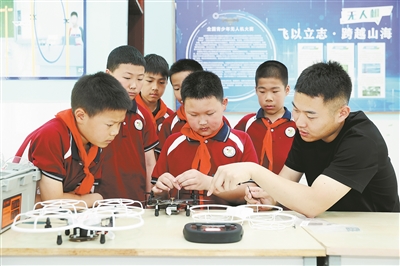 江蘇省宿遷市洋河新區(qū)實驗小學師生進行無人機組裝與拆卸維修。