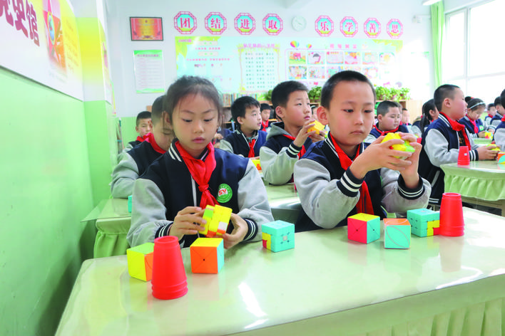 冬日暖陽(yáng)下,忻州市實(shí)驗(yàn)小學(xué)校園里一派生機(jī)勃勃的景象。武術(shù)訓(xùn)練場(chǎng)上,孩子們正在認(rèn)真扎馬步、練拳術(shù),一招一式打得虎虎生威,眼睛里閃爍著堅(jiān)毅和自信的光芒。百人腰鼓隊(duì)排著整齊的隊(duì)伍,伴著音樂(lè)的節(jié)奏不停變換著步伐,鼓槌上的紅綢子上下舞動(dòng),看得人眼花繚亂?;ㄊ交@球挑戰(zhàn)籃球極限,展示籃球技術(shù)和表演的完美結(jié)合?;犹K中,孩子們?cè)诃h(huán)擺的繩索中做著各種跳躍動(dòng)作……操場(chǎng)上,熱火朝天,教學(xué)樓里,每一間教室里都散發(fā)著濃濃的趣味性。“一撇一捺,書寫堂堂正正中國(guó)字”“編程要注意邏輯關(guān)系”“三原色是哪些顏色呢?”……這是市實(shí)驗(yàn)小學(xué)每周三開(kāi)展的第二課堂綜合實(shí)踐活動(dòng),也是孩子們最興奮最高興的校園時(shí)光。