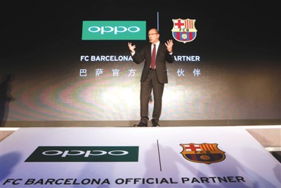去年9月8日,西甲巴塞羅那俱樂(lè)部與OPPO手機(jī)在北京召開(kāi)聯(lián)合新聞發(fā)布會(huì),宣布自2015-2016賽季開(kāi)始,OPPO正式成為巴塞羅那俱樂(lè)部官方合作伙伴。圖為巴塞羅那俱樂(lè)部副主席佩雷斯在新聞發(fā)布會(huì)上致辭。 新華社記者 李 穎攝