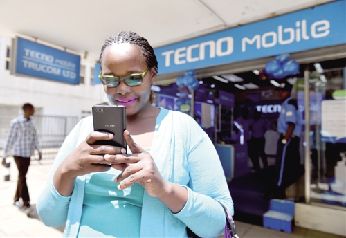 在肯尼亞首都內(nèi)羅畢市中心,一名女子在一家傳音手機專賣店前使用自己的傳音手機。10年間,來自中國深圳的傳音手機在非洲年銷售量從不到100萬臺增至近8000萬臺,榮登國產(chǎn)手機海外銷量榜首,旗下社交聊天軟件注冊用戶過億。 (新華社發(fā))