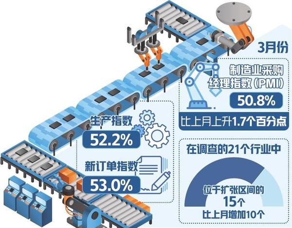 國家統(tǒng)計局服務(wù)業(yè)調(diào)查中心、中國物流與采購聯(lián)合會3月31日發(fā)布的中國采購經(jīng)理指數(shù)顯示,3月份,制造業(yè)采購經(jīng)理指數(shù)、非制造業(yè)商務(wù)活動指數(shù)和綜合PMI產(chǎn)出指數(shù)分別為50.8%、53.0%和52.7%,分別比上月上升1.7個、1.6個和1.8個百分點,三大指數(shù)均位于擴張區(qū)間,企業(yè)生產(chǎn)經(jīng)營活動加快,我國經(jīng)濟景氣水平回升。