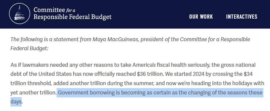 聯(lián)邦預(yù)算問(wèn)責(zé)委員會(huì)主席馬婭·麥吉尼亞斯在發(fā)言稿中直言:“如今,美國(guó)政府借款正變得像季節(jié)的變化一樣規(guī)律而確定?!?/p>