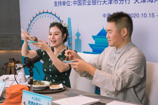 10月16日,在2020中國(guó)旅游產(chǎn)業(yè)博覽會(huì)上,主播通過(guò)直播推介美食。新華社發(fā)