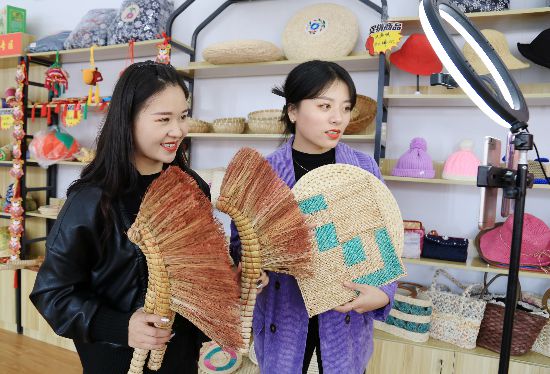 10月11日,甘肅隴南市西和縣消費(fèi)扶貧直銷(xiāo)店,供銷(xiāo)社工作人員正在直播帶貨拓展“線上”農(nóng)產(chǎn)品銷(xiāo)售。李旭春攝(人民視覺(jué))