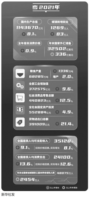 國家統(tǒng)計局2月28日發(fā)布的2021年國民經濟和社會發(fā)展統(tǒng)計公報顯示,2021年,面對百年變局和世紀疫情,全國上下共同努力,我國經濟發(fā)展和疫情防控保持全球領先地位,構建新發(fā)展格局邁出新步伐,高質量發(fā)展取得新成效,實現(xiàn)了“十四五”良好開局。