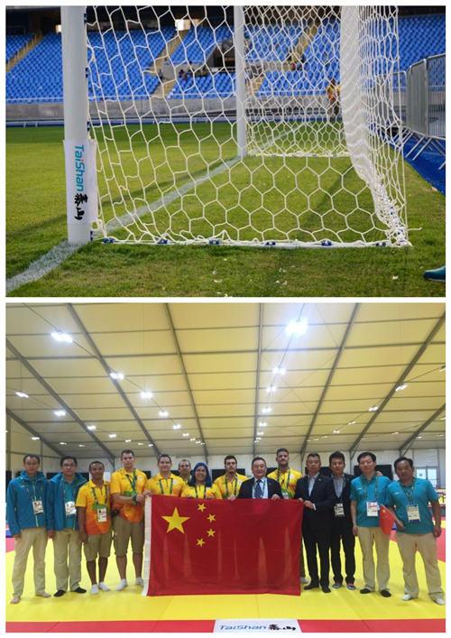 (圖為里約奧運會上泰山體育提供的足球比賽設施和摔跤墊,泰山體育提供)