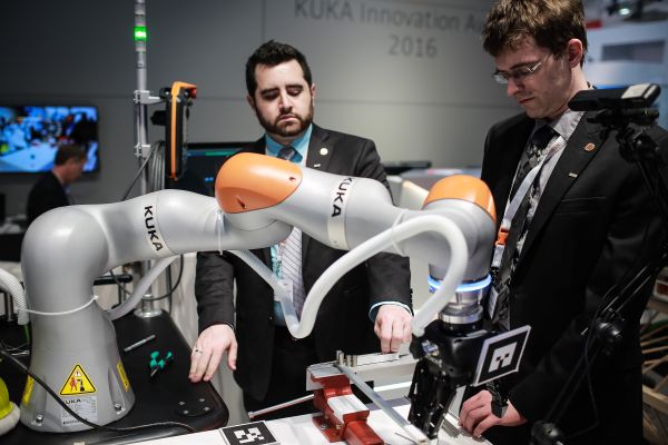 資料圖片:2016年4月27日,在德國漢諾威工業(yè)博覽會上,工作人員在德國庫卡機器人公司展區(qū)展示機器人手臂。新華社記者張帆攝