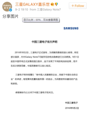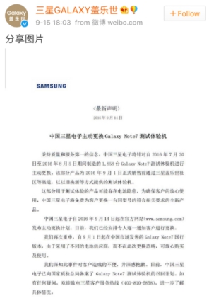 迫于壓力,三星方面關于Note7在中國的政策也發(fā)生了變化。9月14日,三星在國家質(zhì)檢總局備案,宣布召回2016年7月20日至2016年8月5日期間制造的1858臺Note7手機。