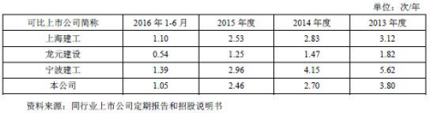 2013年至2016年6月,重慶建工資產(chǎn)負(fù)債率較高,分別為87.59%、86.98%、87.17%、86.31%,高于同行業(yè)上市公司。