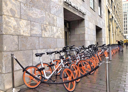 圖為擺放在德國(guó)柏林街頭,準(zhǔn)備投放的摩拜單車(chē)。謝 飛攝