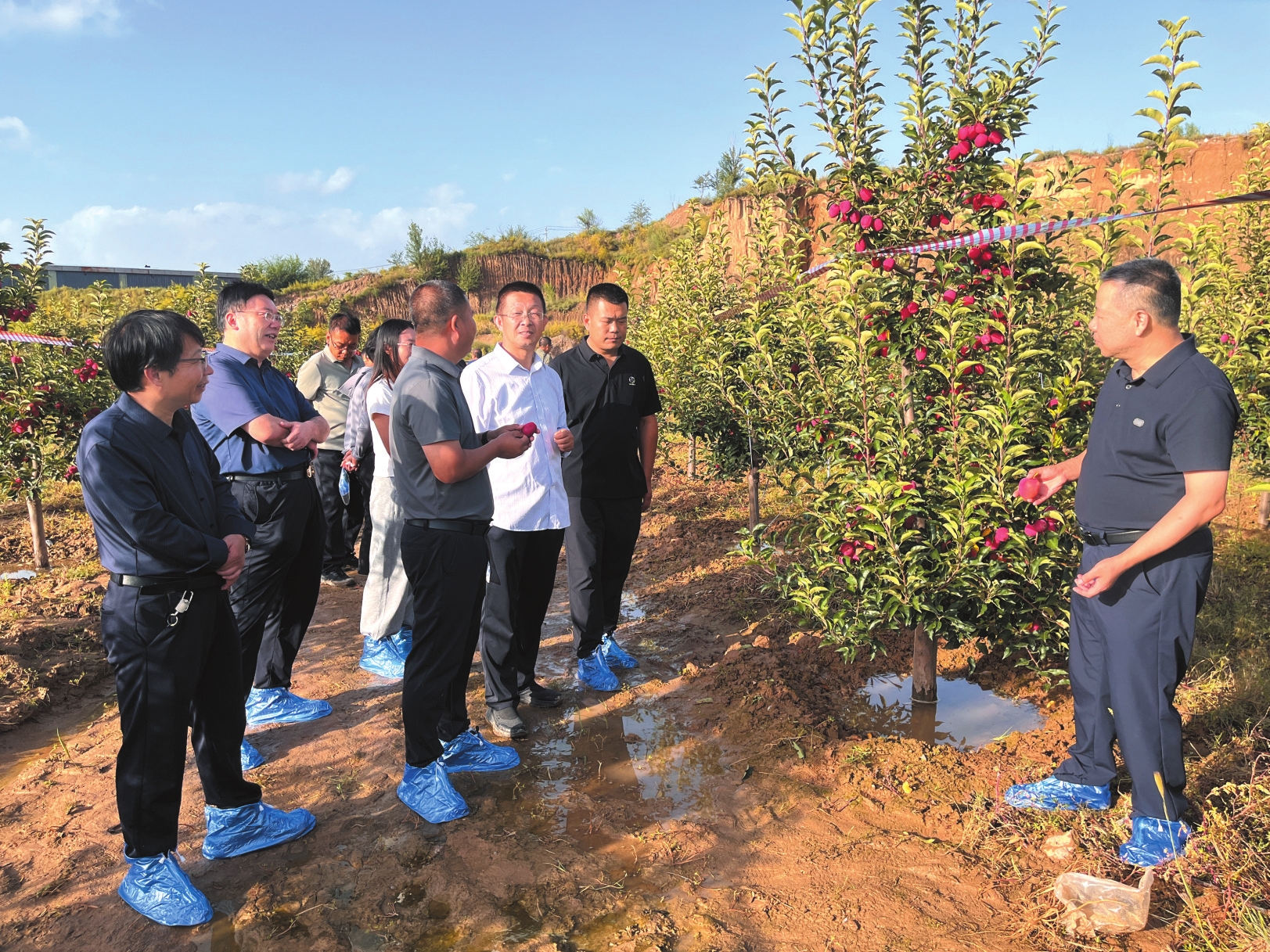 觀摩期間,技術(shù)人員全面介紹了示范果園的建設(shè)背景、關(guān)鍵栽培技術(shù)及主要管理措施,重點(diǎn)講解了河曲紅海棠的品種特性、創(chuàng)新技術(shù)應(yīng)用成效等核心亮點(diǎn)。參會(huì)人員深入田間,實(shí)地察看果樹長(zhǎng)勢(shì)與掛果情況,并與技術(shù)團(tuán)隊(duì)現(xiàn)場(chǎng)交流,詳細(xì)了解配套栽培措施、季節(jié)性管理要點(diǎn)及該品種在新技術(shù)模式下的實(shí)際生長(zhǎng)狀況,進(jìn)一步加深了對(duì)對(duì)品種優(yōu)勢(shì)與技術(shù)推廣成效的認(rèn)識(shí)。