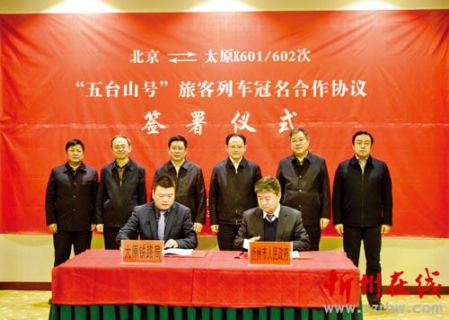 本報(bào)訊(記者 楊峰雷)12月27日,我市與太原鐵路局共同簽署冠名合作協(xié)議,北京至太原K601/K602次列車正式冠名為“五臺(tái)山號(hào)”。市委書記李俊明出席協(xié)議簽署儀式并致辭,市長(zhǎng)鄭連生主持,市委常委、常務(wù)副市長(zhǎng)趙志堅(jiān)出席。太原鐵路局局長(zhǎng)趙春雷專程來(lái)忻出席儀式。