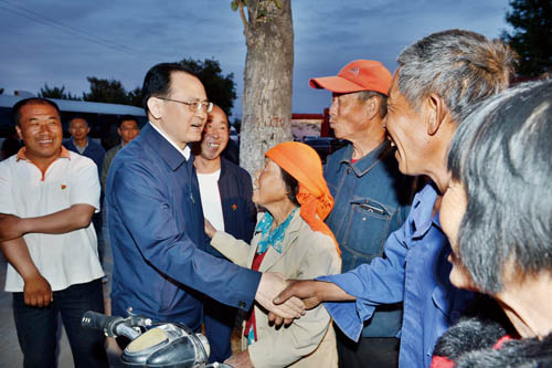 圖為省人大常委會副主任、市委書記李俊明在偏關(guān)縣高家上石會村駐村時(shí)和街頭群眾共話脫貧增收大計(jì)。(本報(bào)記者 宮愛文 攝)