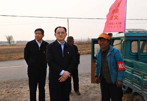 圖為省人大常委會(huì)副主任、市委書記李俊明在定襄縣南王鄉(xiāng)湖村護(hù)林防火檢查站了解情況。本報(bào)記者 劉紀(jì)森 攝