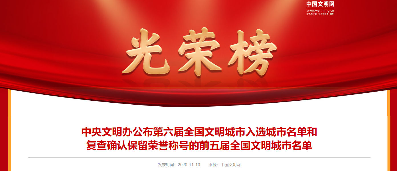 2020年8月以來,中央文明辦按照城市自主申報、省級擇優(yōu)推薦、中央部委審核、媒體集中公示、組織綜合測評、確定入選城市等評選辦法和程序,嚴謹規(guī)范組織第六屆全國文明城市評選工作,嚴格依據(jù)參評城市2018、2019、2020年三年測評總成績排名,提出第六屆全國文明城市入選城市名單,報中央文明委領導同志批準。同時,中央文明辦按照城市自查、省級審核、中央把關、組織測評等復查辦法和程序,認真做好前五屆全國文明城市復查工作,嚴格依據(jù)全國文明城市復查測評成績,提出繼續(xù)保留榮譽稱號的全國文明城市名單,報中央文明委領導同志批準。現(xiàn)將第六屆全國文明城市入選城市名單和復查確認保留榮譽稱號的前五屆全國文明城市名單公布如下。