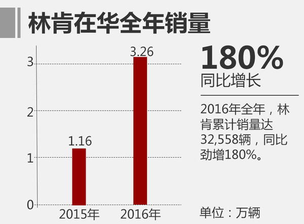 在陸續(xù)引入四款新車后,隨著產(chǎn)品線的逐漸豐富,開始走“親民”路線的林肯在重回中國市場后銷量大幅攀升。較之2015年的11,630輛,2016年全年林肯累計銷量達(dá)32,558輛,同比勁增180%,其增速成為中國成長最快的豪華品牌。在第四季度,林肯單月銷量達(dá)11,562輛,占全年銷量的35.5%,同比增幅162%。