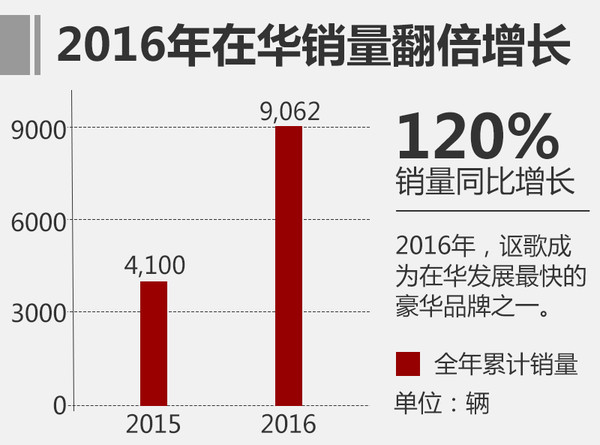 由于此前在華的產(chǎn)品投入等多方問題,入華已經(jīng)達(dá)到10年的本田高端品牌謳歌,銷量并沒有得到顯著提升,2015年謳歌在中國市場的新車上牌量僅為4,100輛,數(shù)據(jù)并不美麗。2016年謳歌重整旗鼓,制定完善的在華戰(zhàn)略,推出首款國產(chǎn)車型CDX后其銷量得到明顯提升,2016年累計售出9,062輛,同比大增120%,成為增速第二快的豪華品牌。