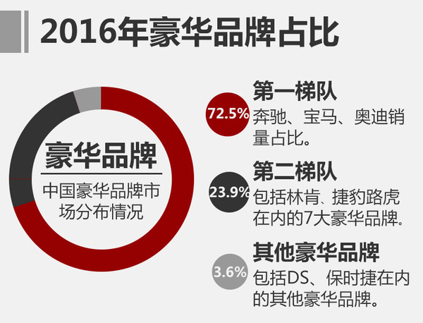 以奔馳、寶馬和奧迪(以下簡稱“BBA”)為代表的豪華品牌第一梯隊依然保持較高的銷量成績。其中2016年奔馳累計售出47.28萬輛,同比增長26.6%;寶馬累計售出(不含MINI品牌)48.22萬輛,同比增長11.3%左右;奧迪累計售出58.91萬輛,同比微增3.7%。2016年BBA總銷量為1,544,118輛,占整個豪華車市場72.5%。