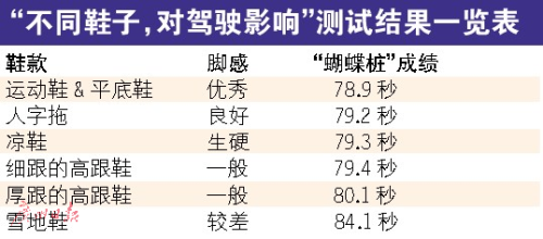 車(chē)天下君找來(lái)多雙款式不同的鞋,包括拖鞋、高跟鞋、運(yùn)動(dòng)鞋、高幫鞋。為最大程度避免誤差,拖鞋還分普通拖鞋和人字拖,高跟鞋還分細(xì)跟和厚跟。讓測(cè)試人員一一穿上這些鞋子,進(jìn)行相關(guān)的測(cè)試,通過(guò)測(cè)試數(shù)據(jù),比較分析得出結(jié)果。
